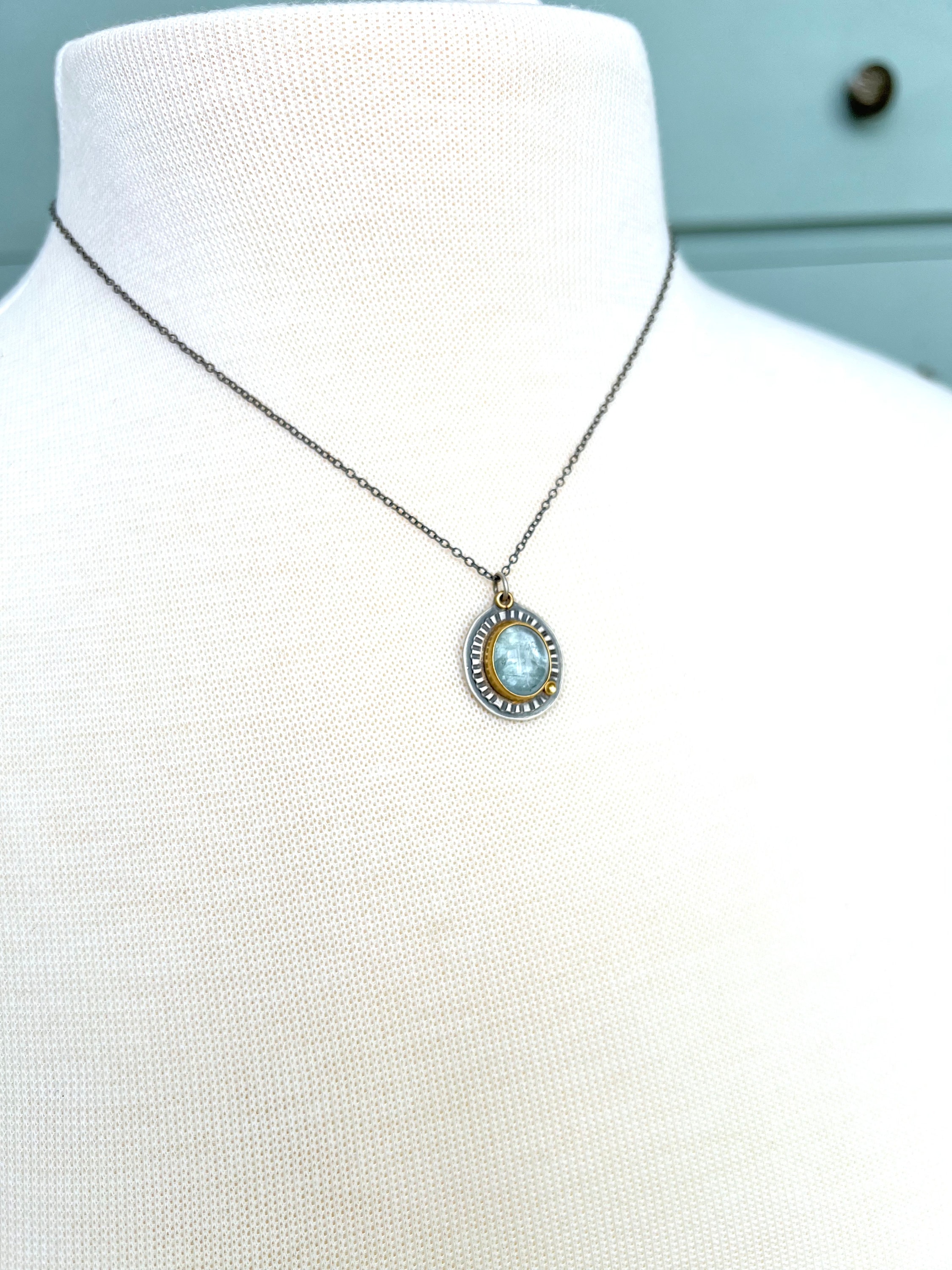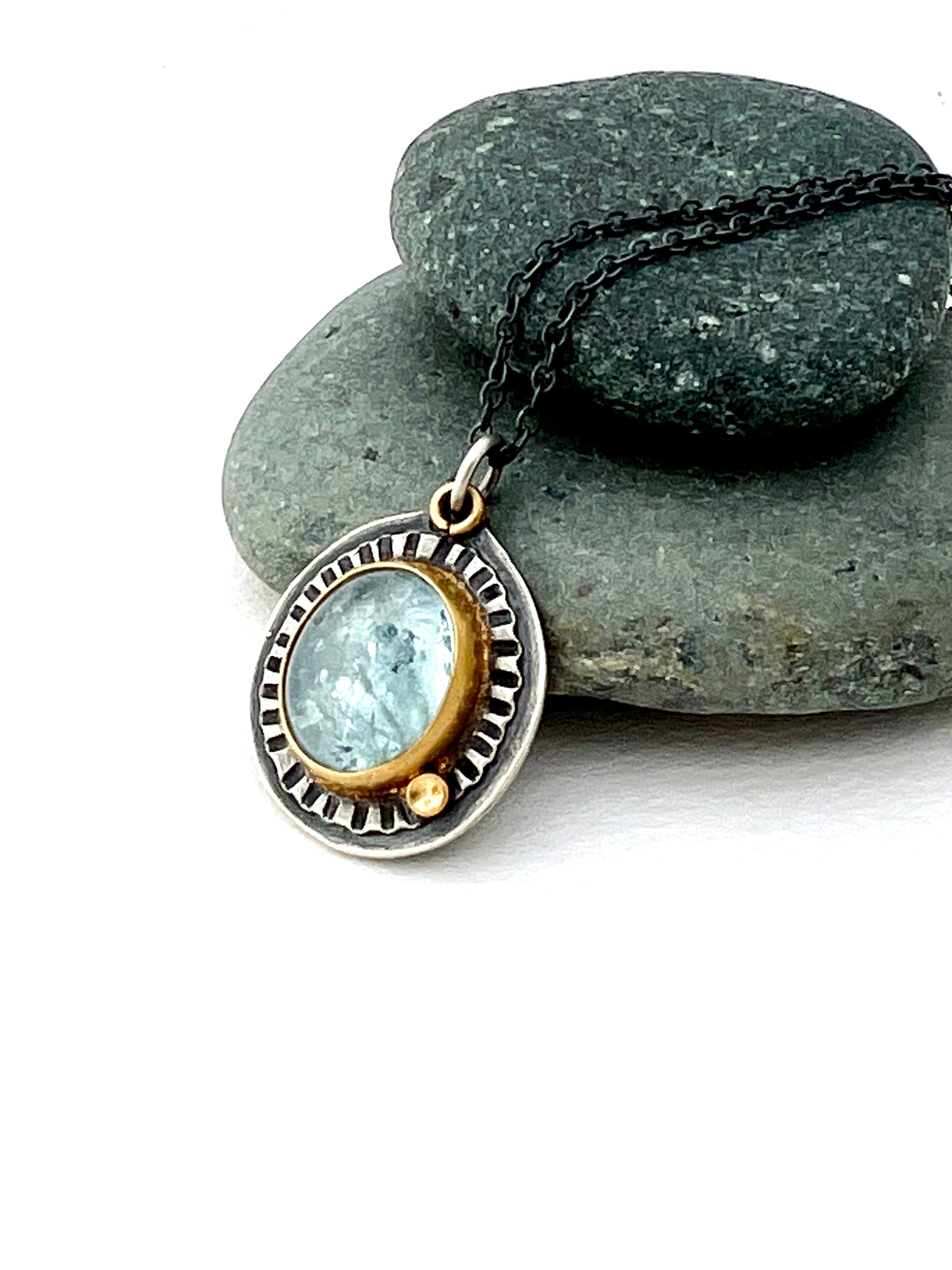 A drop of ocean. This gorgeous aquamarine cabochon is enrobed is 22k gold and set on a sterling silver backplate. The setting is handbuilt with hammered detail and 22k accents.