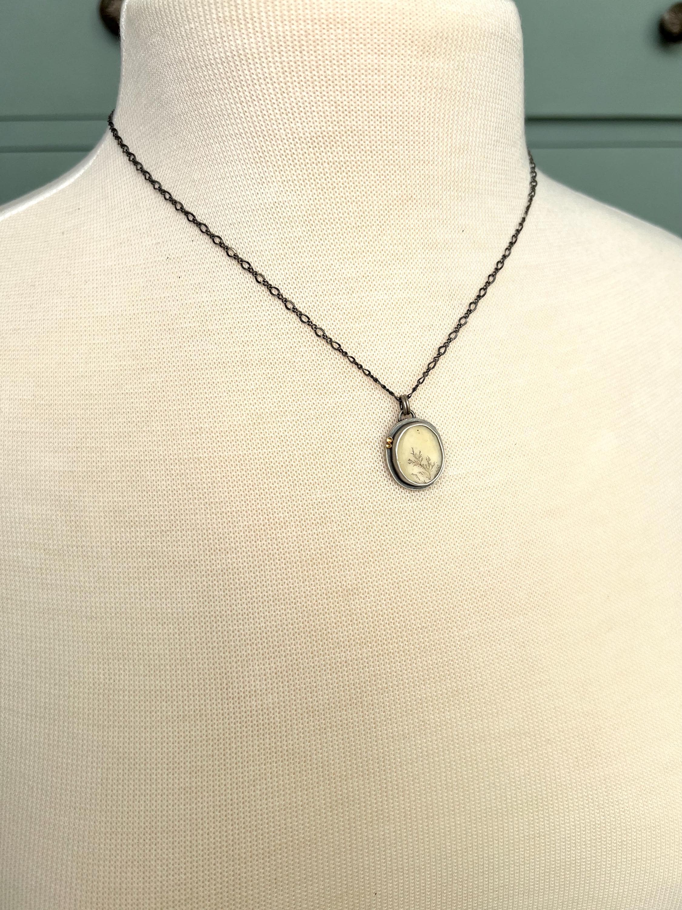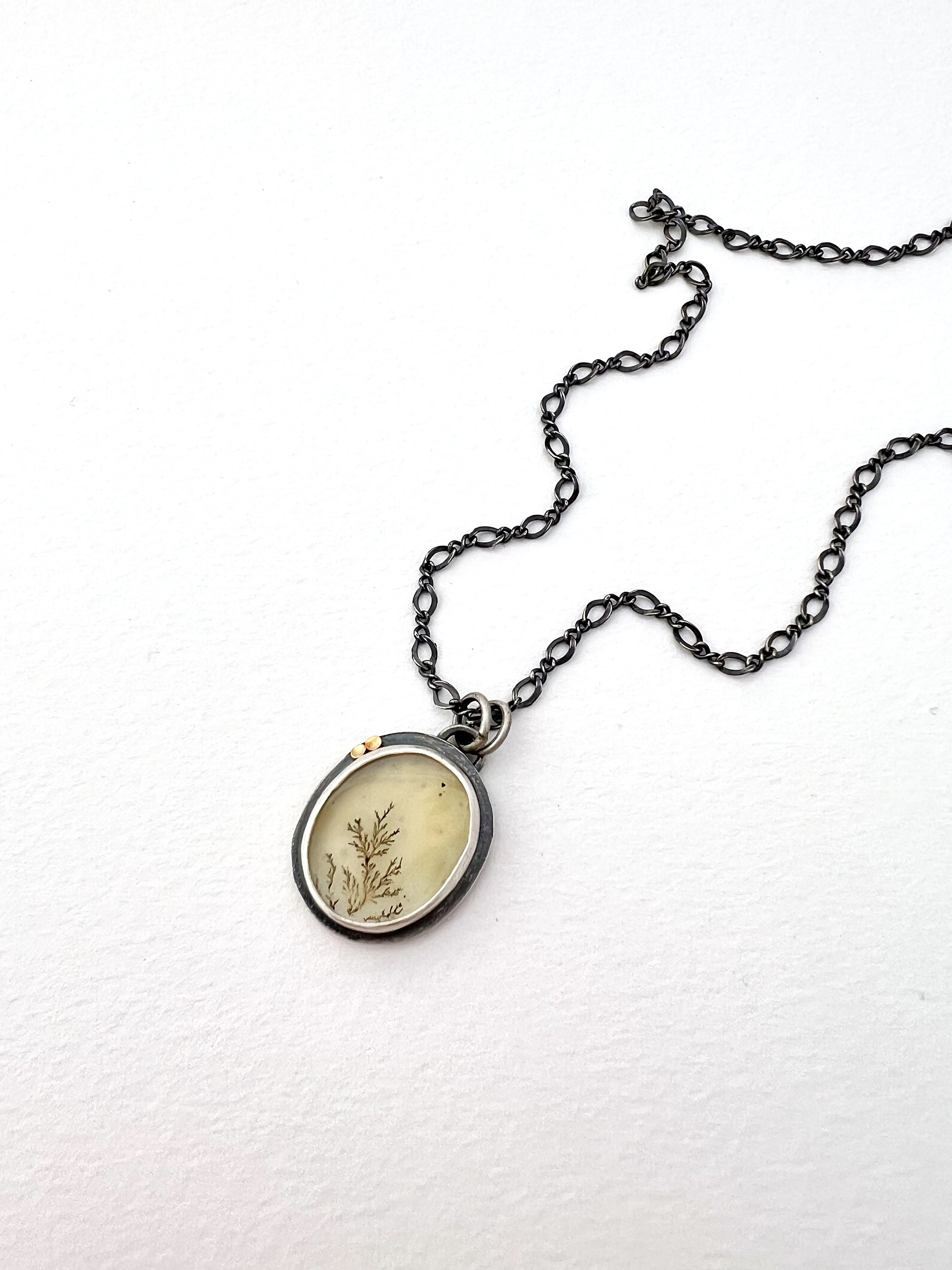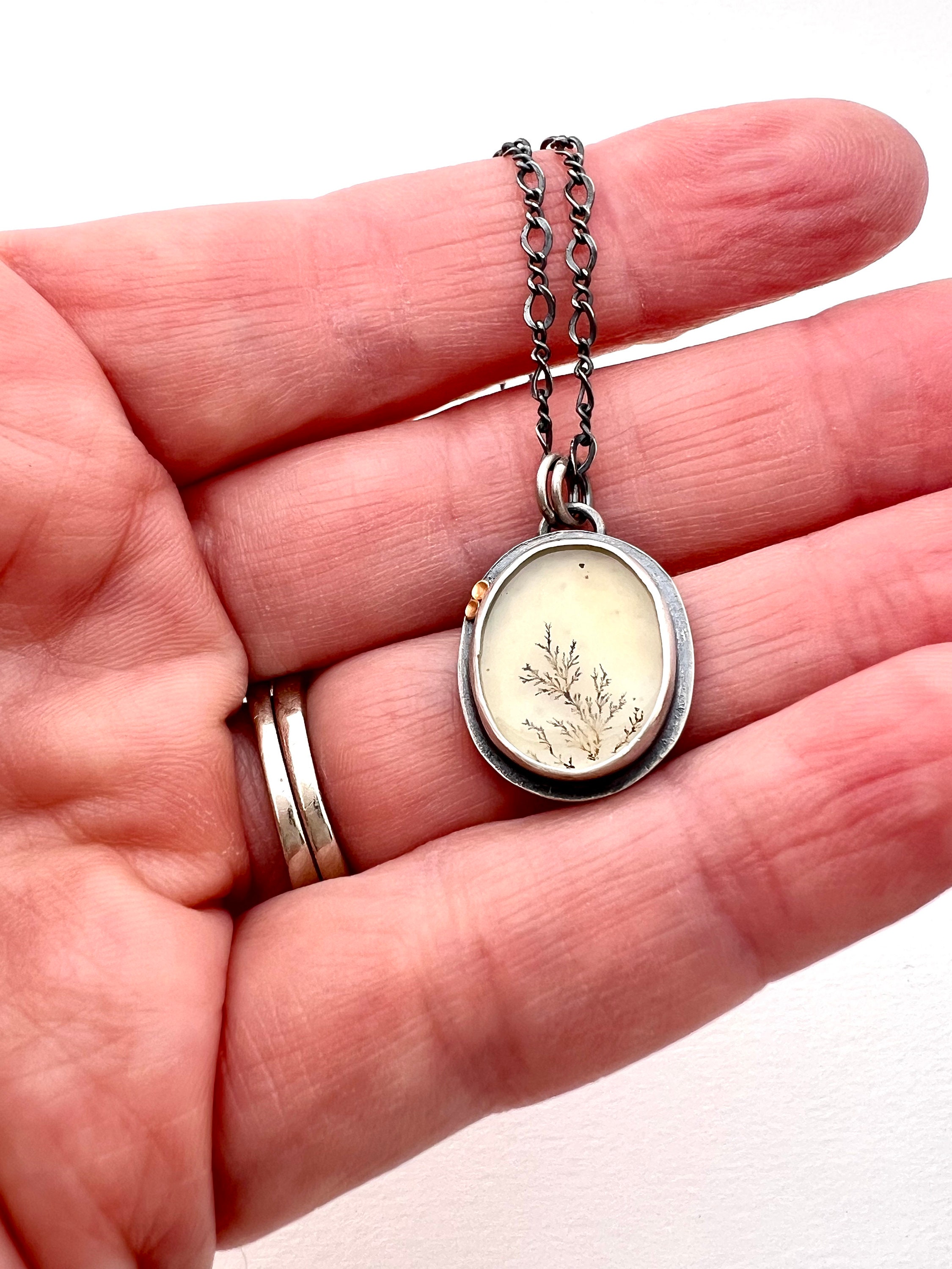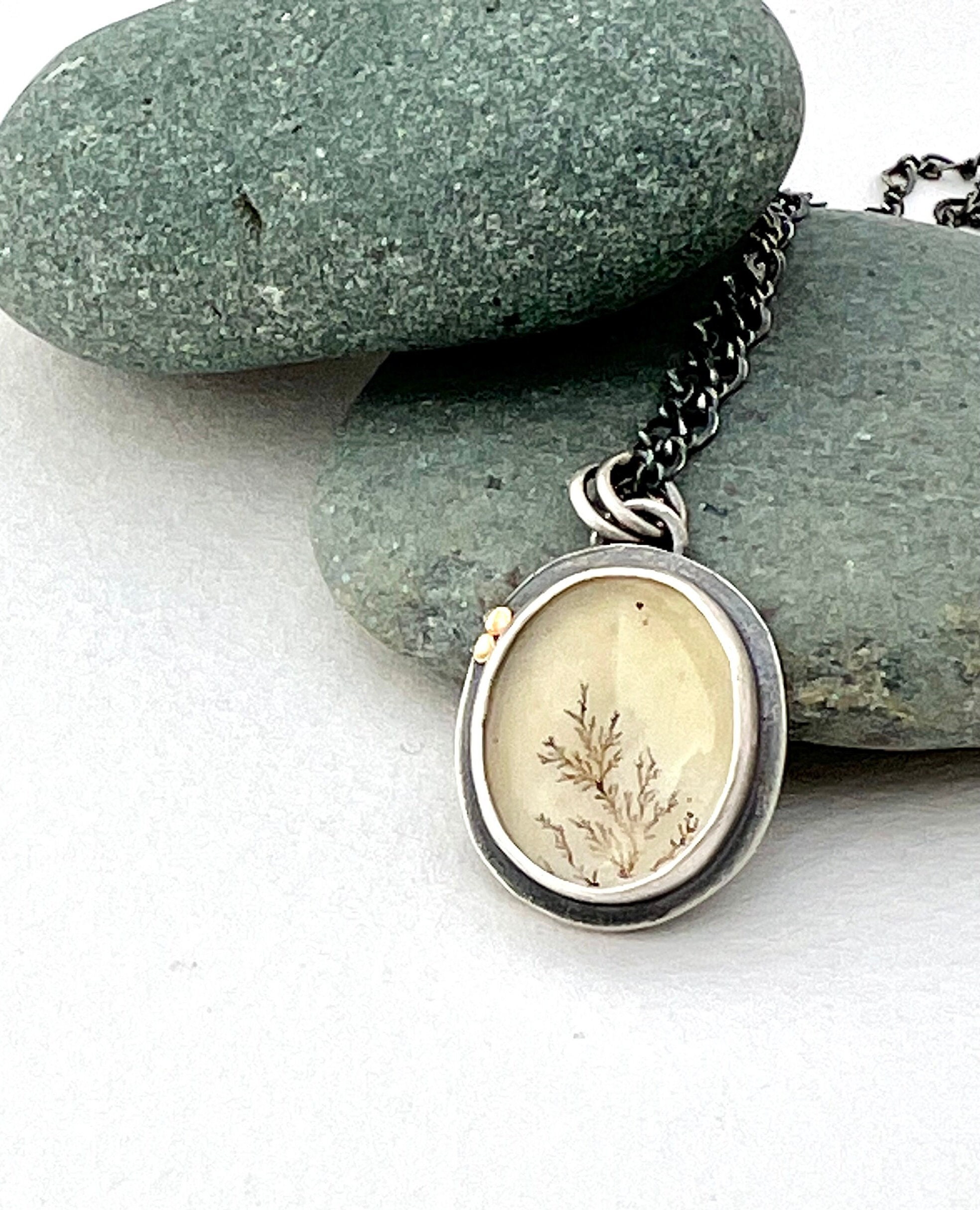 A dendritic agate with soft wispy branches and pale yellow background. Sterling silver setting is handbuilt with tiny accents of 22k gold.