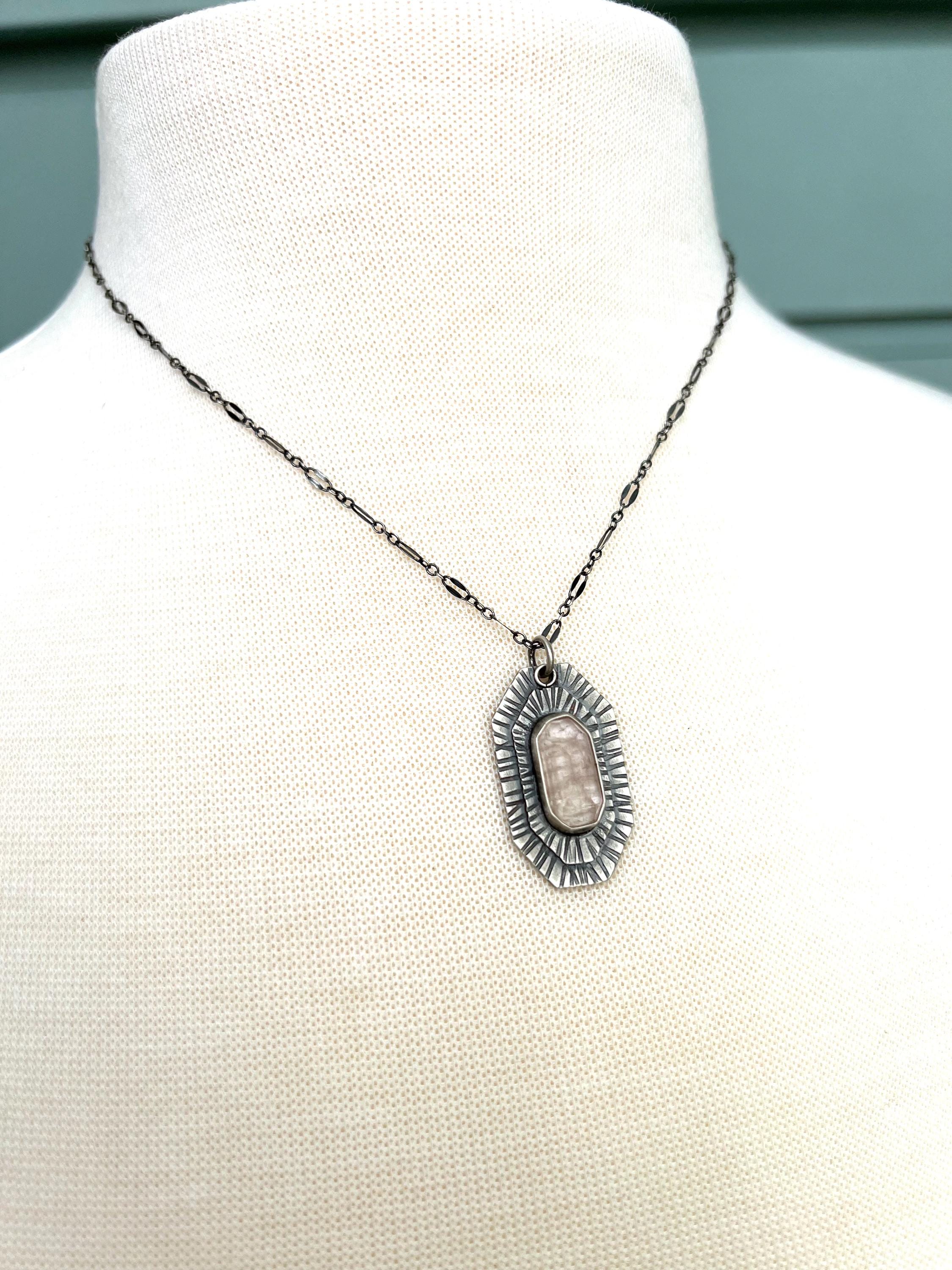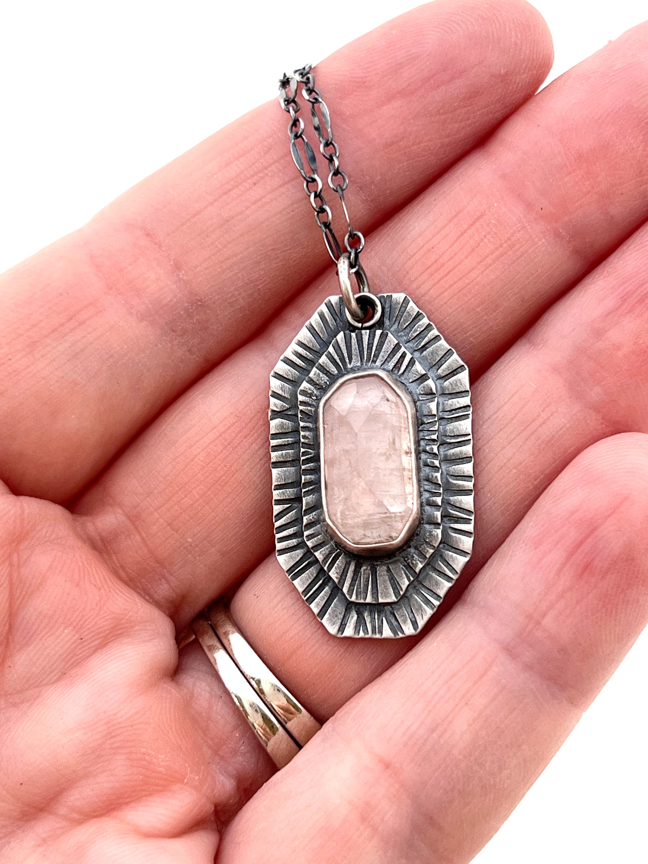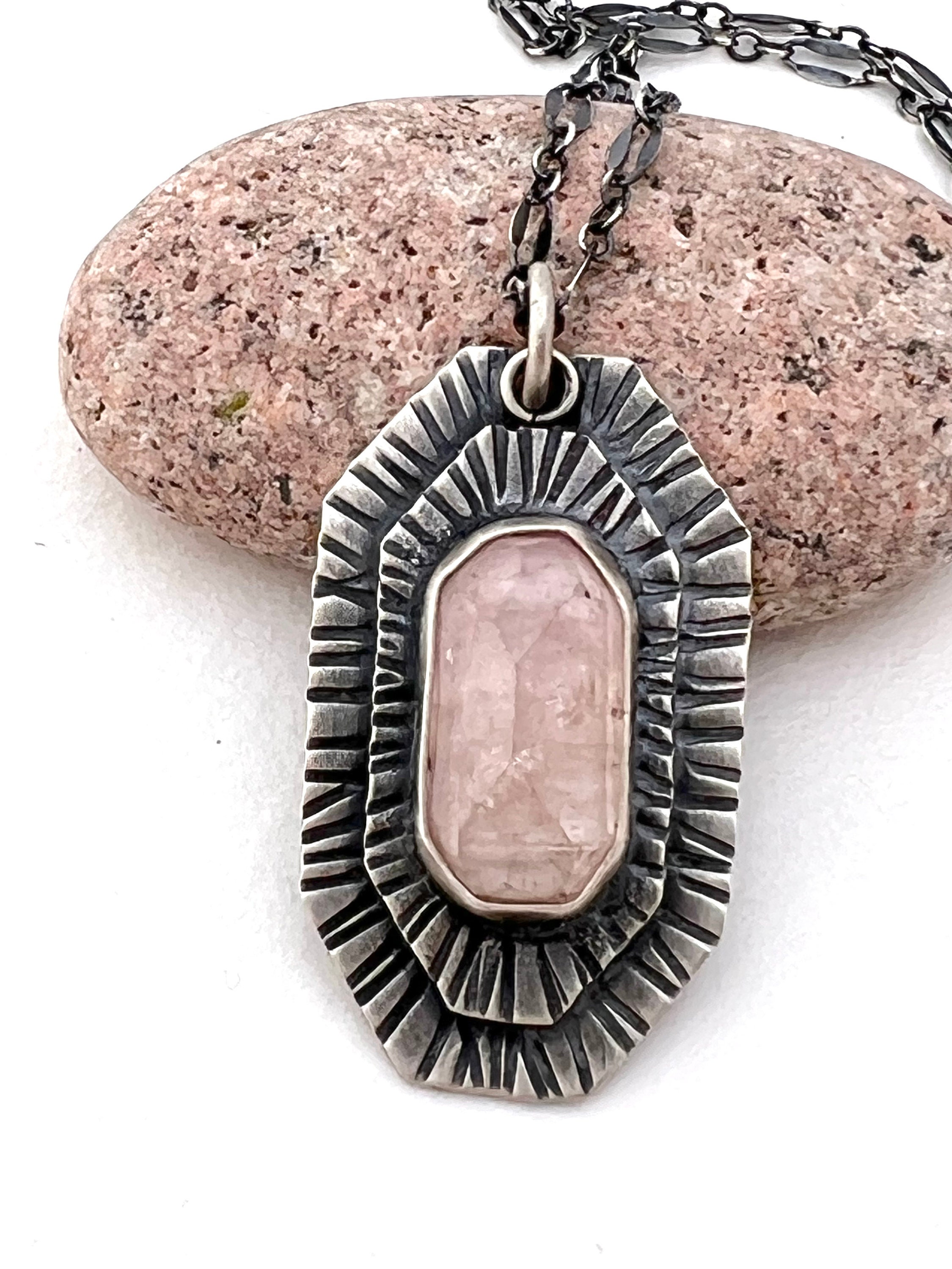 A tourmaline necklace in a beautiful shade of soft pale pink. Setting is handbuilt out of sterling silver with hammered detail. The stone is rose cut with natural inclusions.