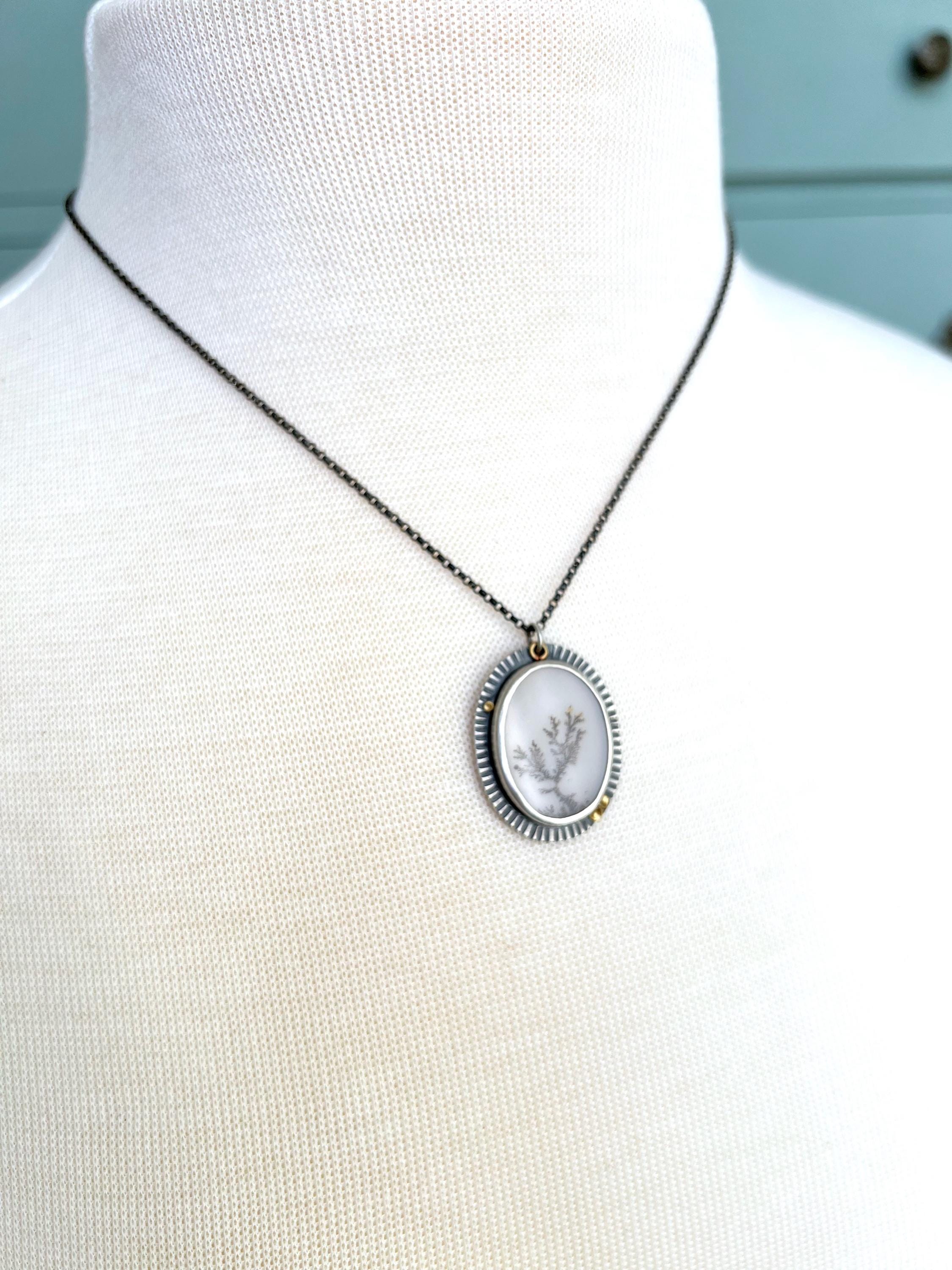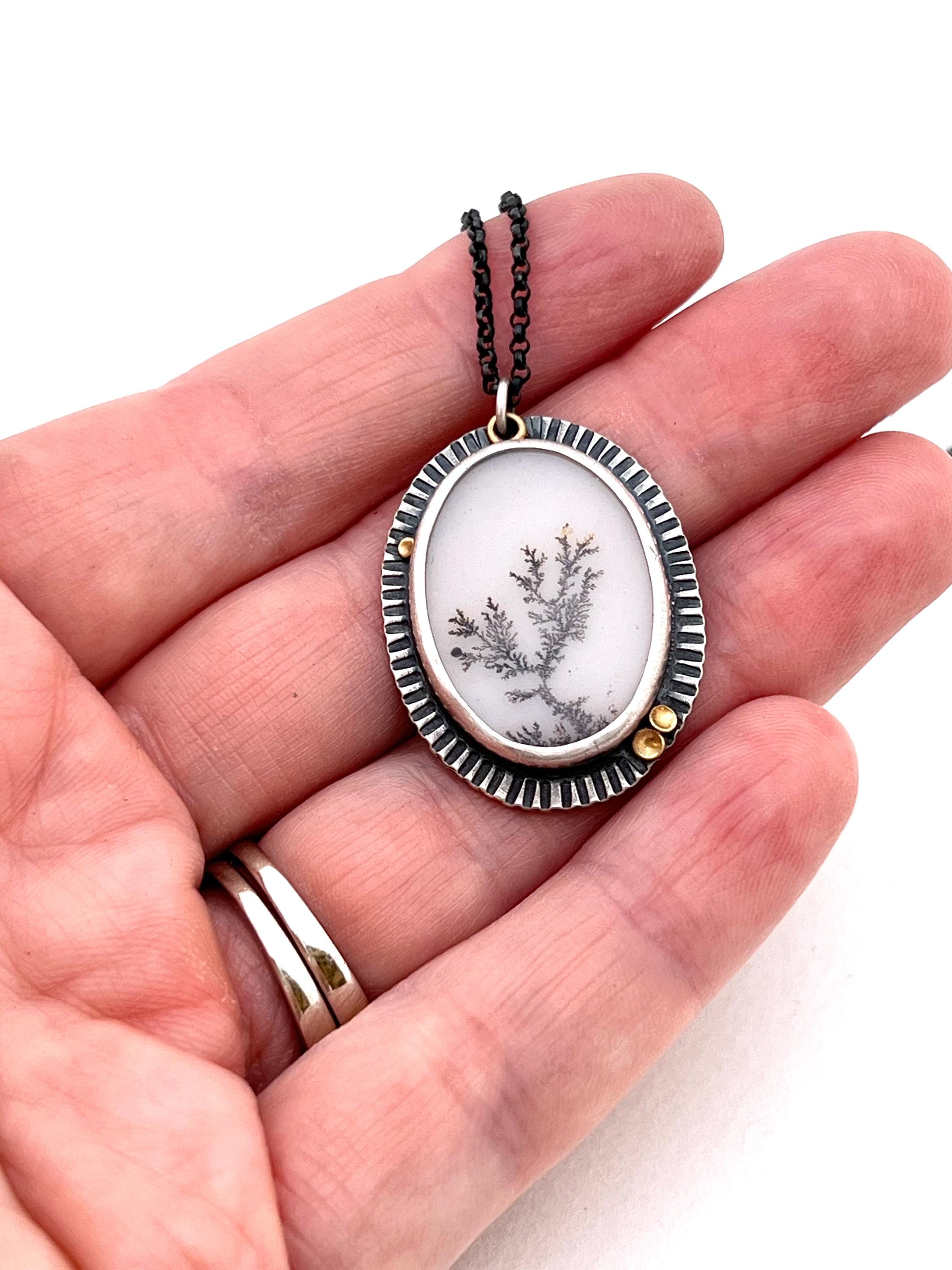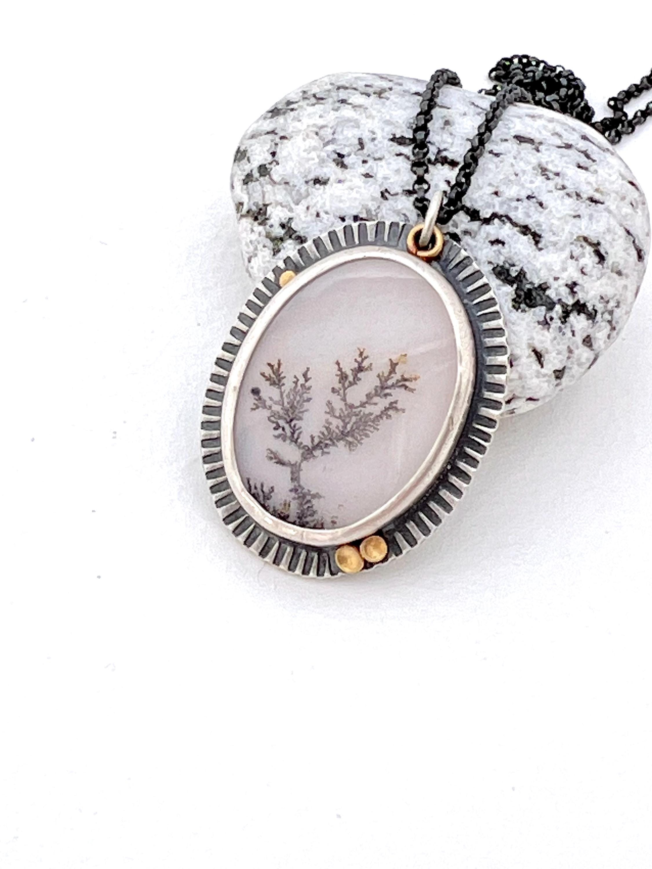 A stunning oval dendritic agate with a black tree-like dendrite and white background. The stone is set in a hand-built sterling silver setting with hammered detail and 22k gold accents. A truly gorgeous one-of-a-kind heirloom!