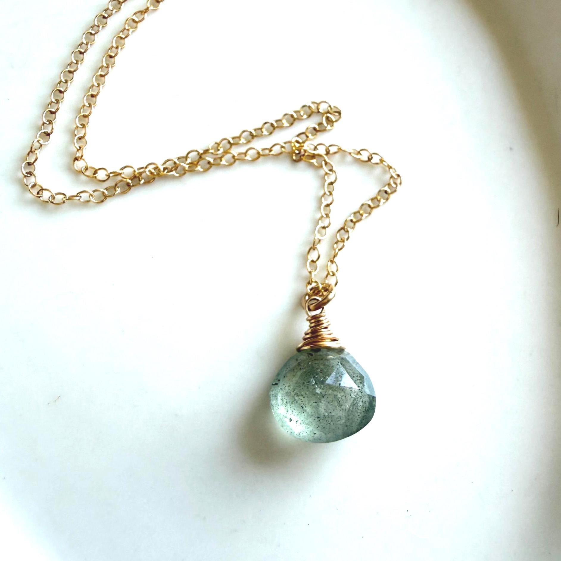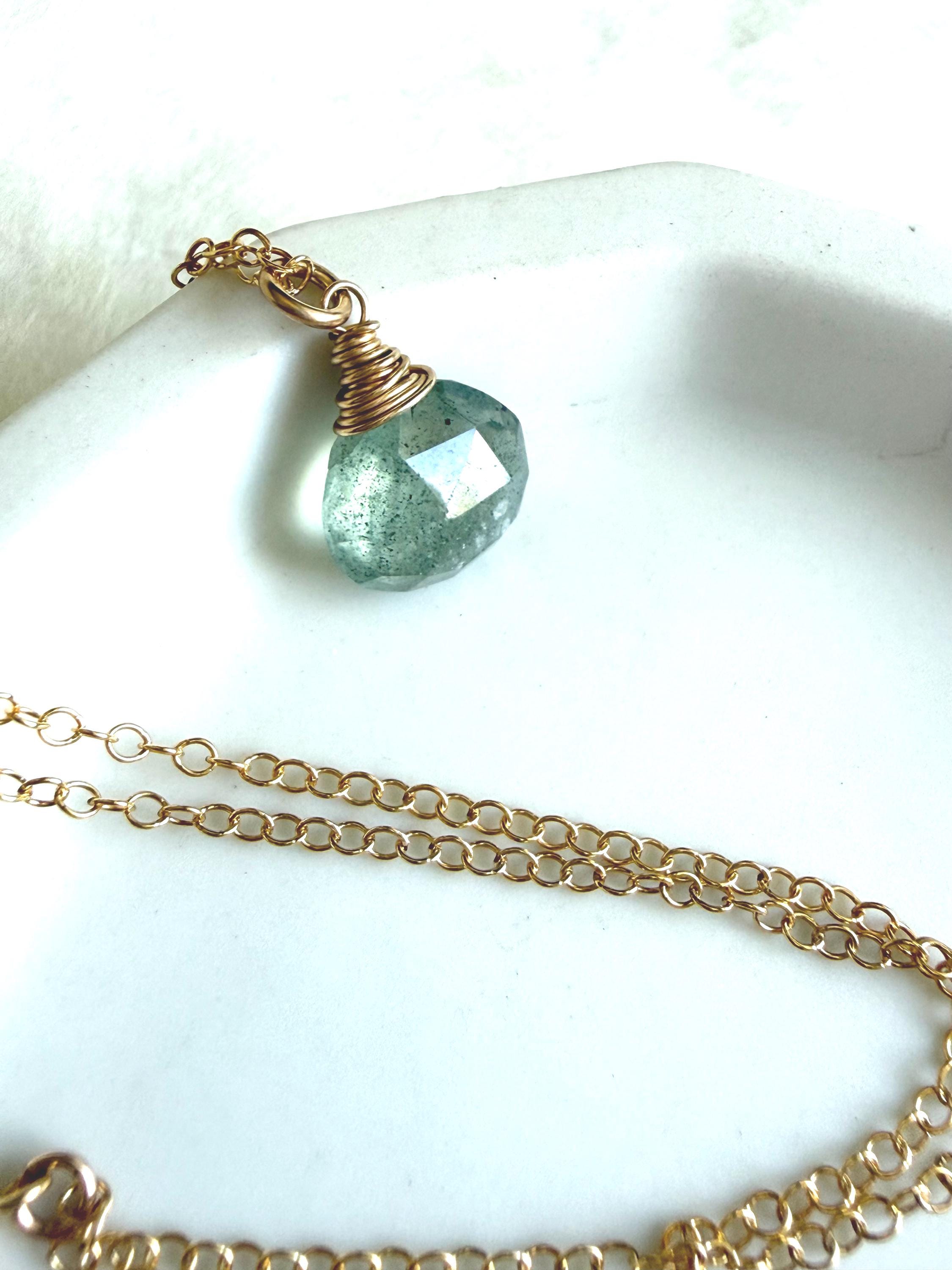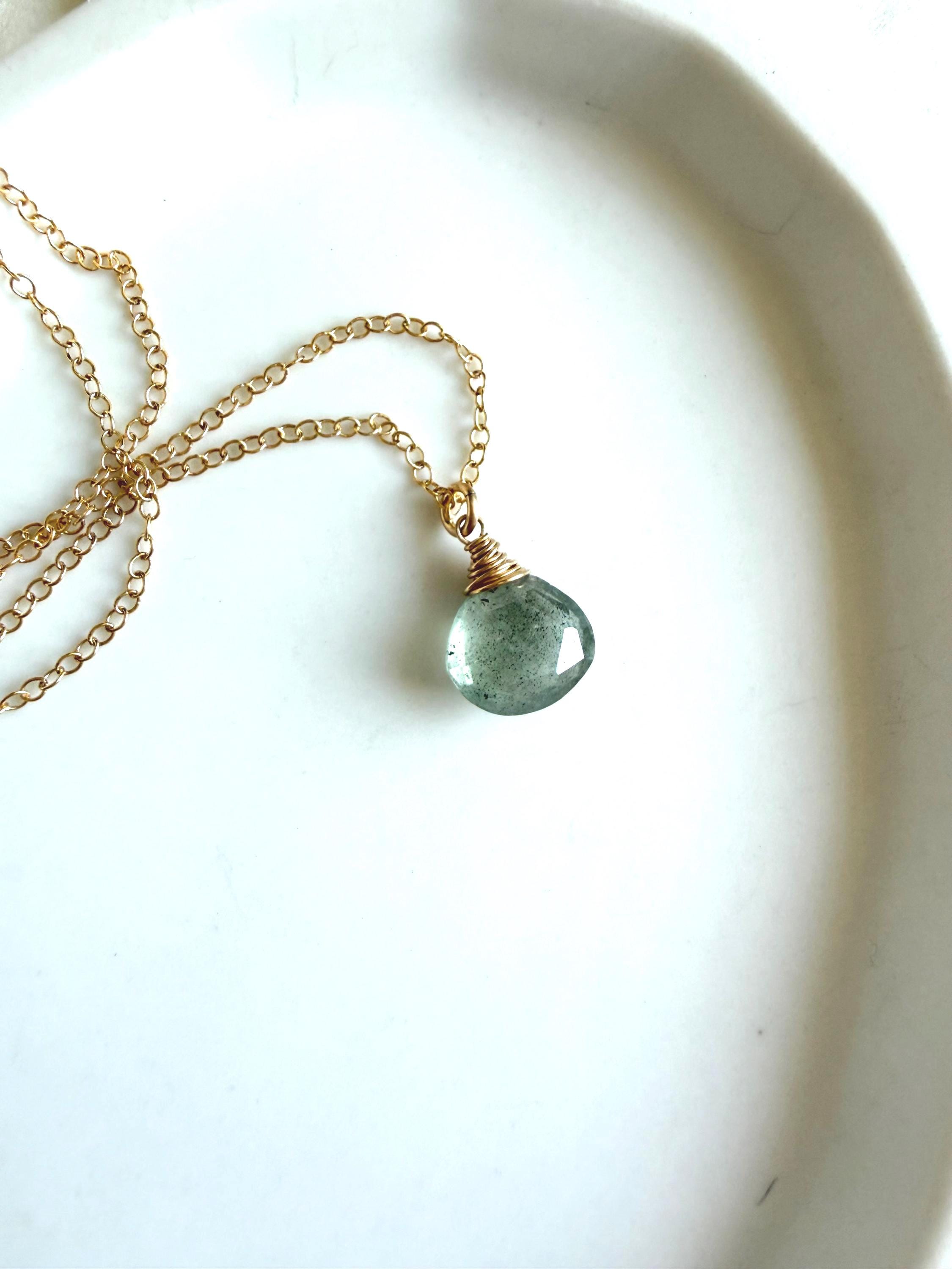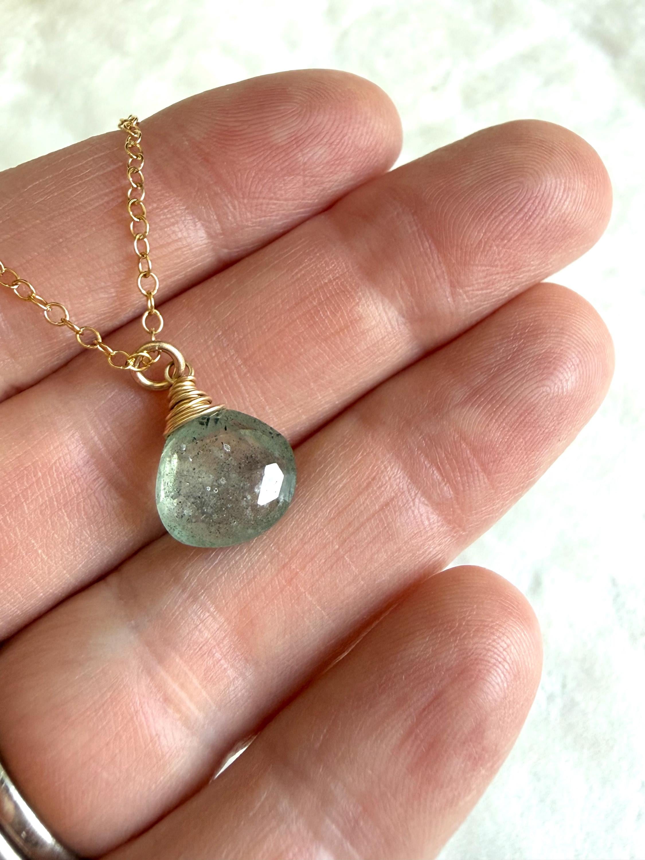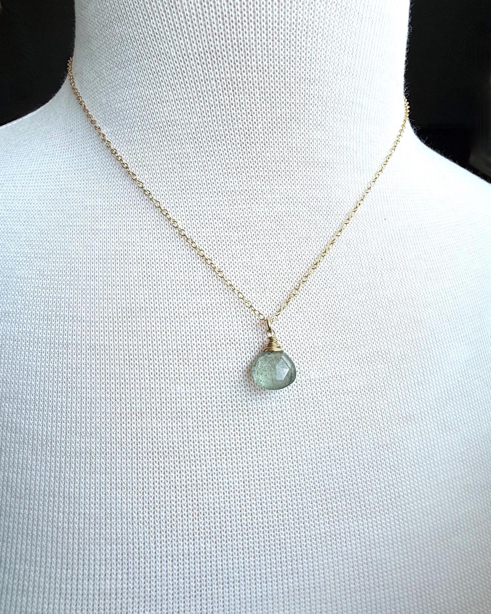 Moss aquamarine is an easy stone to love. Watery blue-green in color with moss-like inclusions which give it an organic, earthy vibe. This one is displayed simply to let its beauty shine through. All metal is 14k gold filled.