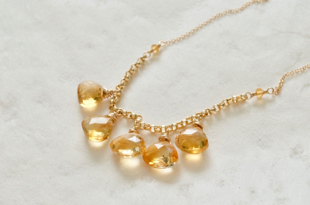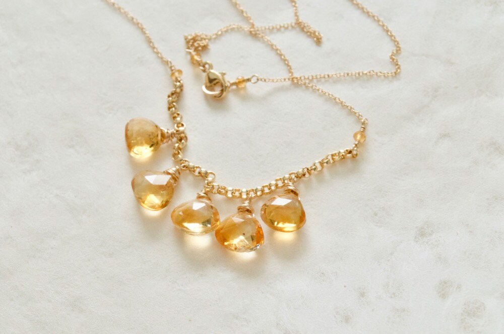 The five citrine drops on this necklace have a beautiful golden sparkle. They are wire wrapped onto a 14K gold-filled chain with small accents of tiny citrine beads.